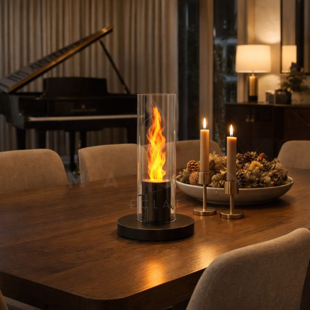 Les cheminées de table Tornado Maison Éclat s’invitent partout : dans votre salon, sur votre terrasse ou même votre bureau. La flamme circulaire qui danse avec élégance, crée une ambiance chaleureuse et reste totalement sûre, sans fumée ni odeur. Un effet magique, de jour comme de nuit !