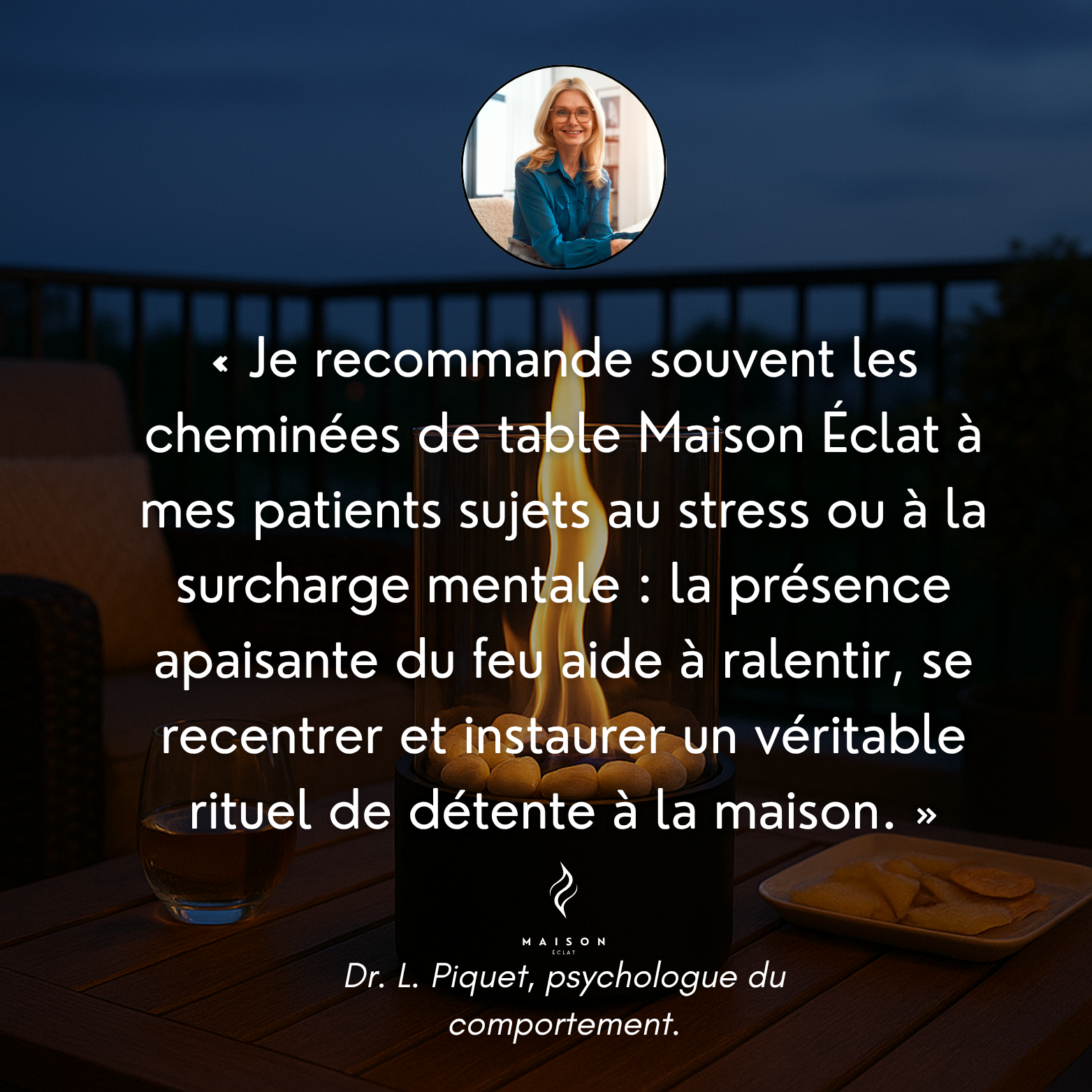 La cheminée de table Maison Éclat utilise un Mouvement Hypnotique Calibré – la seule technique visuelle reconnue pour activer instantanément le système parasympathique (le mode "Repos").